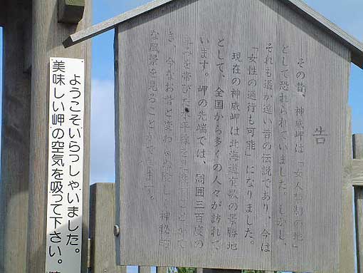 ここはかつて、源義経との恋に破れたアイヌの娘が「和人の船が女を乗せてここを通ったら呪う・・・」と言い残して身投げしたという秘話が伝わっている。その後、実際に海難事故が続いたため、女人禁制とされていた。 |