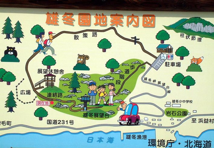 切り立つ断崖で有名な雄冬岬。この展望台へ登ると道路からは見られないその景観を垣間見る事ができます。国道の「雄冬岬展望台」という案内板から入って、細く急な道を登ると駐車場に到着します。